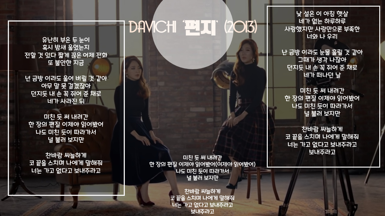 위의 커버 디자인도 링크한 유튜브 영상에서 이미지를 캡쳐해서 작업했다. 오래간만에 다비치 이미지로 작업해보긴 했는데 즉흥적으로 만든 것도 있지만 이미 이전에 작업했던 것과 비슷한 콘셉이기도 하다. 이 노래를 들을 때마다 '보내주라고'하는 가사의 여운이 너무나 강렬하다.